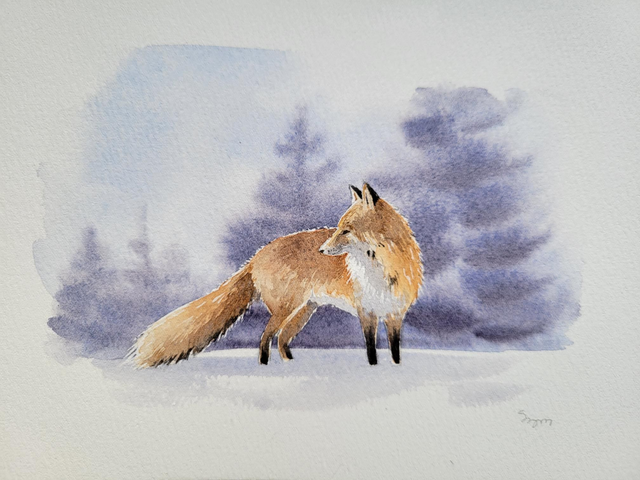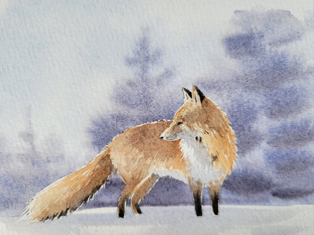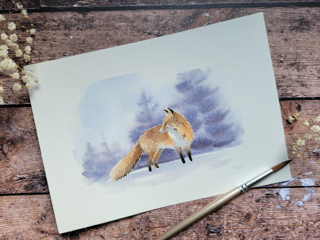 Aquarelle originale renard dans la neige. Format 21×14,8 cm.